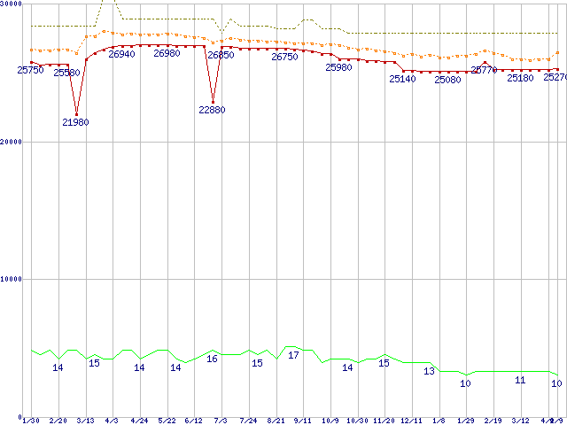Core 2 Duo E8600 (3.33GHz,L2 6MB)の価格推移↑前グラフ↓次グラフ(2009年1月30日〜2010年4月9日)※このグラフは過去のデータも税率5%相当に調整した税込み相当額のグラフです。●関連グラフCPU主要製品の最安値推移CPU主要製品(最安値2万円〜3万円未満)の最安値推移Intel系CPUの最安値推移LGA775 (FSB 1333MHz,Dual Core,TDP 65W)の最安値推移●凡例最安値(点線部は販売店未確認または未調査)平均値最高値ショップ数