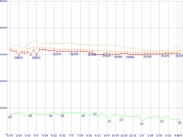 Core 2 Quad Q9650 (3.00GHz,L2 6MB×2)の価格推移↑前グラフ↓次グラフ(2009年1月30日〜2010年4月9日)※このグラフは過去のデータも税率5%相当に調整した税込み相当額のグラフです。●関連グラフCPU主要製品の最安値推移CPU主要製品(最安値3万円〜6万円未満)の最安値推移Intel系CPUの最安値推移LGA775 (FSB 1333MHz,Quad Core,TDP 95W)の最安値推移●凡例最安値(点線部は販売店未確認または未調査)平均値最高値ショップ数