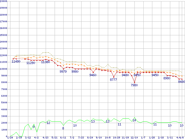 HD154UI (1.5TB,32MB)の価格推移↑前グラフ↓次グラフ(2009年1月29日〜2010年4月8日)※このグラフは過去のデータも税率5%相当に調整した税込み相当額のグラフです。 税率変更や、総額表示方式導入(2004年4月)の影響は除いています。●関連グラフHDD/SSD主要製品の最安値推移HDD/SSD主要製品(最安値1万円未満)の最安値推移HDD 1.5TB〜2TB未満の最安値推移EcoGreen F2 (5400rpm,3Gb/s)の最安値推移●凡例最安値(点線部は販売店未確認または未調査)平均値最高値ショップ数