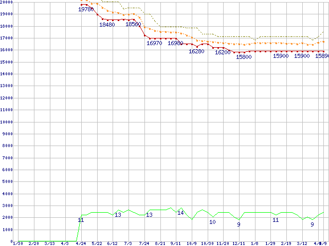 Core 2 Quad Q8400 (2.66GHz,L2 2MB×2)の価格推移↑前グラフ↓次グラフ(2009年1月30日〜2010年4月9日)※このグラフは過去のデータも税率5%相当に調整した税込み相当額のグラフです。●関連グラフCPU主要製品の最安値推移CPU主要製品(最安値1万円〜2万円未満)の最安値推移Intel系CPUの最安値推移LGA775 (FSB 1333MHz,Quad Core,TDP 95W)の最安値推移●凡例最安値(点線部は販売店未確認または未調査)平均値最高値ショップ数