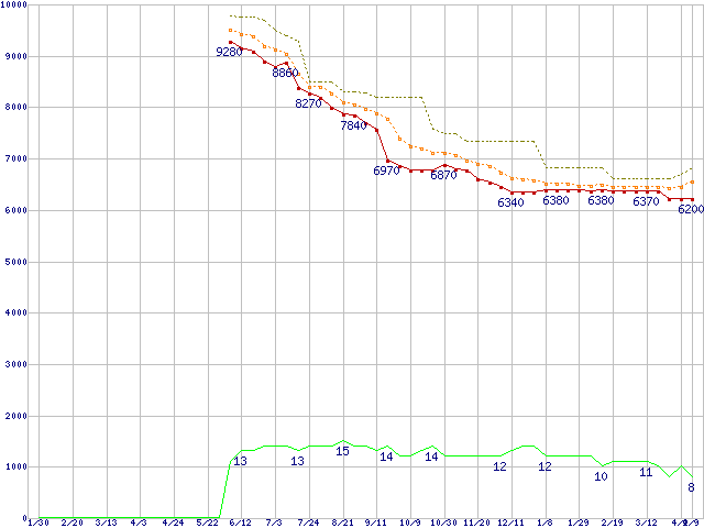 Athlon II X2 250 (3.0GHz,L2 1MB×2,TDP 65W)の価格推移↑前グラフ↓次グラフ(2009年1月30日〜2010年4月9日)※このグラフは過去のデータも税率5%相当に調整した税込み相当額のグラフです。●関連グラフCPU主要製品の最安値推移CPU主要製品(最安値1万円未満)の最安値推移AMD系CPUの最安値推移Socket AM3 (Dual Core)の最安値推移●凡例最安値(点線部は販売店未確認または未調査)平均値最高値ショップ数
