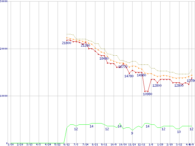 Phenom II X4 945 (3.0GHz,L2 512KB×4,L3 6MB,TDP 95W)の価格推移↑前グラフ↓次グラフ(2009年1月30日〜2010年4月9日)※このグラフは過去のデータも税率5%相当に調整した税込み相当額のグラフです。●関連グラフCPU主要製品の最安値推移CPU主要製品(最安値1万円〜2万円未満)の最安値推移AMD系CPUの最安値推移Socket AM3 (HyperTransport 3.0,Quad Core Core)の最安値推移●凡例最安値(点線部は販売店未確認または未調査)平均値最高値ショップ数
