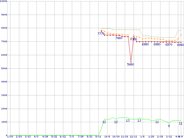 Athlon II X2 240e (2.8GHz,L2 1MB×2,TDP 45W)の価格推移↑前グラフ↓次グラフ(2009年1月30日〜2010年4月9日)※このグラフは過去のデータも税率5%相当に調整した税込み相当額のグラフです。●関連グラフCPU主要製品の最安値推移CPU主要製品(最安値1万円未満)の最安値推移AMD系CPUの最安値推移Socket AM3 (Dual Core)の最安値推移●凡例最安値(点線部は販売店未確認または未調査)平均値最高値ショップ数