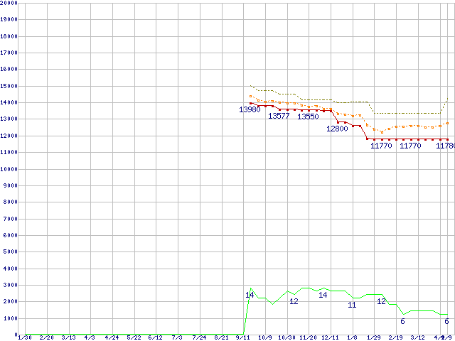 Athlon II X4 605e (2.3GHz,L2 512KB×4,TDP 45W)の価格推移↑前グラフ↓次グラフ(2009年1月30日〜2010年4月9日)※このグラフは過去のデータも税率5%相当に調整した税込み相当額のグラフです。●関連グラフCPU主要製品の最安値推移CPU主要製品(最安値1万円〜2万円未満)の最安値推移AMD系CPUの最安値推移Socket AM3 (Quad Core)の最安値推移●凡例最安値(点線部は販売店未確認または未調査)平均値最高値ショップ数