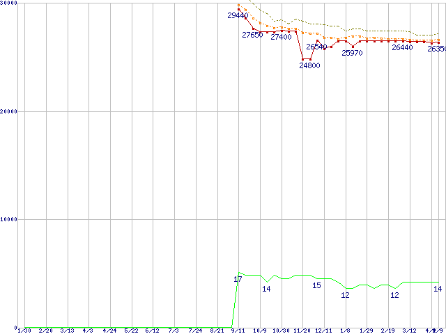 Core i7-860 (2.80GHz)の価格推移↑前グラフ↓次グラフ(2009年1月30日〜2010年4月9日)※このグラフは過去のデータも税率5%相当に調整した税込み相当額のグラフです。●関連グラフCPU主要製品の最安値推移CPU主要製品(最安値2万円〜3万円未満)の最安値推移Intel系CPUの最安値推移LGA1156 (L3キャッシュ8MB,Quad Core,Hyper-Threading,TDP 82〜95W)の最安値推移●凡例最安値(点線部は販売店未確認または未調査)平均値最高値ショップ数