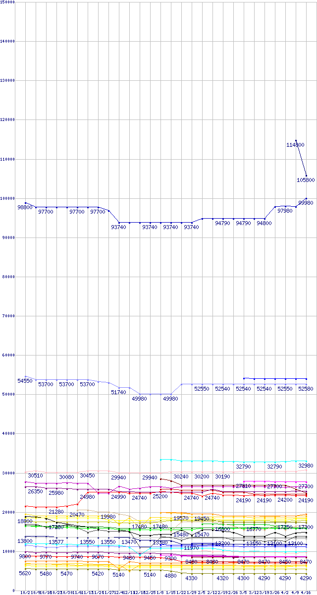 CPU主要製品の最安値推移↑前グラフ↓次グラフ(2009年10月2日〜2010年4月16日)※このグラフは過去のデータも税率5%相当に調整した税込み相当額のグラフです。凡例Core i7-980X Extreme Edition (3.33GHz)Core i7-975 Extreme Edition (3.33GHz)Core i7-960 (3.20GHz)Core i7-870 (2.93GHz)Core i7-860S (2.53GHz)Core 2 Quad Q9650 (3.00GHz,L2 6MB×2)Core i7-930 (2.80GHz)Core i7-860 (2.80GHz)Core 2 Duo E8600 (3.33GHz,L2 6MB)Core i5-670 (3.46GHz)Core i5-750S (2.4GHz)Core 2 Quad Q9550 (2.83GHz,L2 6MB×2)Core i5-661 (3.33GHz)Core i5-660 (3.33GHz)Core i5-750 (2.66GHz)Core 2 Quad Q9400 (2.66GHz,L2 3MB×2)Core 2 Duo E8500 (3.16GHz,L2 6MB)Core i5-650 (3.2GHz)Phenom II X4 965 Black Edition (3.4GHz,L2 512KB×4,L3 6MB,TDP 125W)Core 2 Quad Q8400 (2.66GHz,L2 2MB×2)Phenom II X4 910e (2.6GHz,L2 512KB×4,L3 6MB,TDP 65W)Core 2 Duo E8400 (3GHz,L2 6MB)Phenom II X4 955 Black Edition (3.2GHz,L2 512KB×4,L3 6MB,TDP 125W)Phenom II X4 945 (3.0GHz,L2 512KB×4,L3 6MB,TDP 95W)Core i3-540 (3.06GHz)Core 2 Duo E7600 (3.06GHz,L2 3MB)Athlon II X4 605e (2.3GHz,L2 512KB×4,TDP 45W)Athlon II X4 635 (2.9GHz,L2 512KB×4,TDP 95W)Core i3-530 (2.93GHz)Core 2 Duo E7500 (2.93GHz,L2 3MB)Athlon II X4 630 (2.8GHz,L2 512KB×4,TDP 95W)Phenom II X2 555 Black Edition (3.2GHz,L2 512KB×2,L3 6MB)Pentium G6950 (2.8GHz)Pentium E6600 (3.06GHz,L2 2MB)Athlon II X4 620 (2.6GHz,L2 512KB×4,TDP 95W)Athlon II X3 440 (3.0GHz,L2 512KB×3,TDP 95W)Athlon II X2 255 (3.1GHz,L2 1MB×2,TDP 65W)Pentium E6500 (2.93GHz,L2 2MB)Athlon II X2 240e (2.8GHz,L2 1MB×2,TDP 45W)Athlon II X2 235e (2.7GHz,L2 1MB×2,TDP 45W)Athlon II X2 250 (3.0GHz,L2 1MB×2,TDP 65W)Athlon II X2 245 (2.9GHz,L2 1MB×2,TDP 65W)Celeron E3400 (2.6GHz)Celeron E3300 (2.5GHz)※製品名をクリックすると個別のグラフを表示します※点線部は販売店が確認できなかった、または調査データがないことを示します