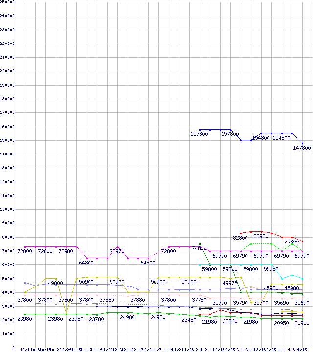 | HDD/SSD主要製品(最安値2万円以上)の最安値推移 |