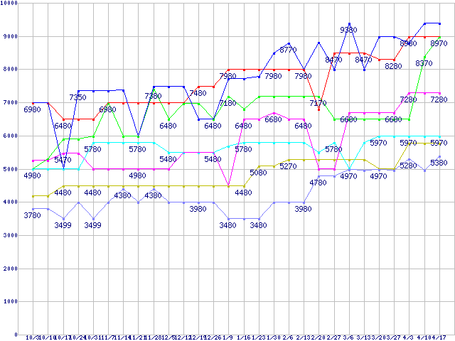 | メモリ主要製品(最安値5千円〜1万円未満)の最安値推移 |