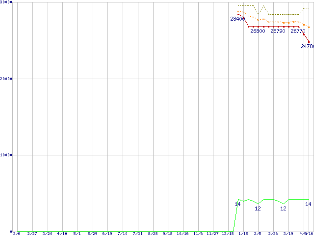 Core i5-670 (3.46GHz)の価格推移↑前グラフ↓次グラフ(2009年2月6日〜2010年4月16日)※このグラフは過去のデータも税率5%相当に調整した税込み相当額のグラフです。●関連グラフCPU主要製品の最安値推移CPU主要製品(最安値2万円〜3万円未満)の最安値推移Intel系CPUの最安値推移LGA1156 (L3キャッシュ4MB,Dual Core,GPU内蔵,Hyper-Threading,TDP 73〜87W)の最安値推移●凡例最安値(点線部は販売店未確認または未調査)平均値最高値ショップ数