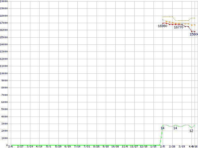 Phenom II X4 910e (2.6GHz,L2 512KB×4,L3 6MB,TDP 65W)の価格推移↑前グラフ↓次グラフ(2009年2月6日〜2010年4月16日)※このグラフは過去のデータも税率5%相当に調整した税込み相当額のグラフです。●関連グラフCPU主要製品の最安値推移CPU主要製品(最安値1万円〜2万円未満)の最安値推移AMD系CPUの最安値推移Socket AM3 (HyperTransport 3.0,Quad Core Core)の最安値推移●凡例最安値(点線部は販売店未確認または未調査)平均値最高値ショップ数