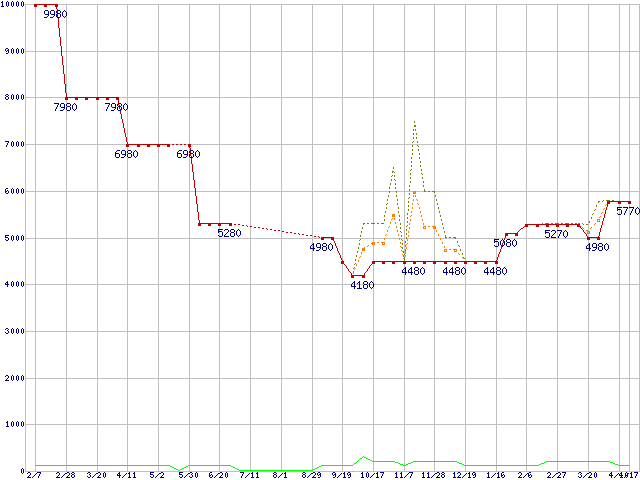 PC3-12800 2GBの価格推移↑前グラフ↓次グラフ(2009年2月7日〜2010年4月17日)※このグラフは過去のデータも税率5%相当に調整した税込み相当額のグラフです。 税率変更や、総額表示方式導入(2004年4月)の影響は除いています。●関連グラフメモリ主要製品の最安値推移2GBモジュール/1GBモジュール×2枚の最安値推移メモリ主要製品(最安値5千円〜1万円未満)の最安値推移PC3-12800(DDR3-1600) DDR3 SDRAM DIMMの最安値推移●凡例最安値(点線部は販売店未確認または未調査)平均値最高値ショップ数