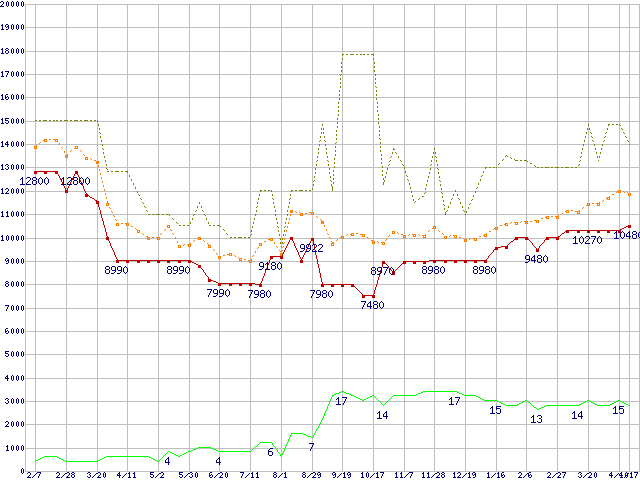 PC3-12800 2GB×2枚組みセットの価格推移↑前グラフ↓次グラフ(2009年2月7日〜2010年4月17日)※このグラフは過去のデータも税率5%相当に調整した税込み相当額のグラフです。 税率変更や、総額表示方式導入(2004年4月)の影響は除いています。●関連グラフメモリ主要製品の最安値推移4GBモジュール/2GBモジュール×2枚の最安値推移メモリ主要製品(最安値1万円以上)の最安値推移PC3-12800(DDR3-1600) DDR3 SDRAM DIMMの最安値推移●凡例最安値(点線部は販売店未確認または未調査)平均値最高値ショップ数