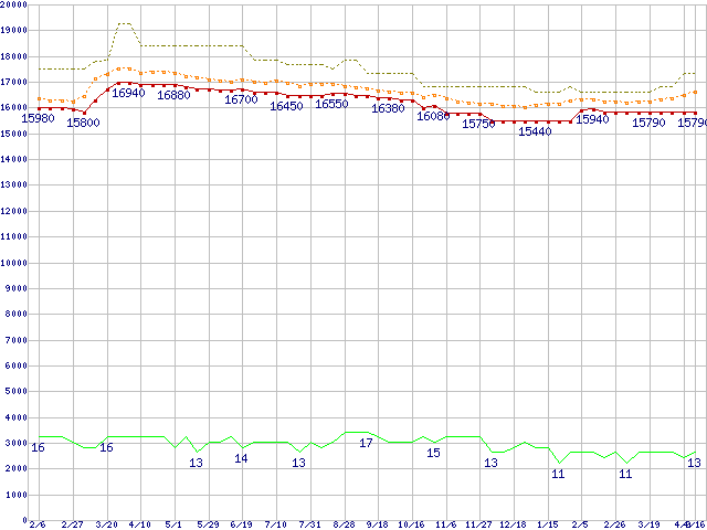 Core 2 Duo E8400 (3GHz,L2 6MB)の価格推移↑前グラフ↓次グラフ(2009年2月6日〜2010年4月16日)※このグラフは過去のデータも税率5%相当に調整した税込み相当額のグラフです。●関連グラフCPU主要製品の最安値推移CPU主要製品(最安値1万円〜2万円未満)の最安値推移Intel系CPUの最安値推移LGA775 (FSB 1333MHz,Dual Core,TDP 65W)の最安値推移●凡例最安値(点線部は販売店未確認または未調査)平均値最高値ショップ数