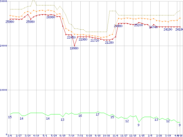 Core 2 Quad Q9550 (2.83GHz,L2 6MB×2)の価格推移↑前グラフ↓次グラフ(2009年2月6日〜2010年4月16日)※このグラフは過去のデータも税率5%相当に調整した税込み相当額のグラフです。●関連グラフCPU主要製品の最安値推移CPU主要製品(最安値2万円〜3万円未満)の最安値推移Intel系CPUの最安値推移LGA775 (FSB 1333MHz,Quad Core,TDP 95W)の最安値推移●凡例最安値(点線部は販売店未確認または未調査)平均値最高値ショップ数