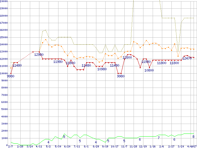 PC2-6400 4GBの価格推移↑前グラフ(2009年2月7日〜2010年4月17日)※このグラフは過去のデータも税率5%相当に調整した税込み相当額のグラフです。 税率変更や、総額表示方式導入(2004年4月)の影響は除いています。●関連グラフメモリ主要製品の最安値推移4GBモジュール/2GBモジュール×2枚の最安値推移メモリ主要製品(最安値1万円以上)の最安値推移PC2-6400(DDR2-800) DDR2 SDRAM DIMMの最安値推移●凡例最安値(点線部は販売店未確認または未調査)平均値最高値ショップ数