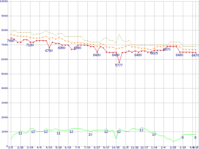 HD103SI (1TB,32MB)の価格推移↑前グラフ↓次グラフ(2009年2月5日〜2010年4月15日)※このグラフは過去のデータも税率5%相当に調整した税込み相当額のグラフです。 税率変更や、総額表示方式導入(2004年4月)の影響は除いています。●関連グラフHDD/SSD主要製品の最安値推移HDD/SSD主要製品(最安値1万円未満)の最安値推移HDD 1TB〜1.5TB未満の最安値推移EcoGreen F2 (5400rpm,3Gb/s)の最安値推移●凡例最安値(点線部は販売店未確認または未調査)平均値最高値ショップ数