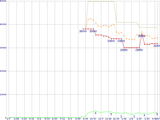 PC3-10600 4GB×2枚組みセットの価格推移↑前グラフ↓次グラフ(2009年2月7日〜2010年4月17日)※このグラフは過去のデータも税率5%相当に調整した税込み相当額のグラフです。 税率変更や、総額表示方式導入(2004年4月)の影響は除いています。●関連グラフメモリ主要製品の最安値推移メモリ主要製品(最安値1万円以上)の最安値推移PC3-10600(DDR3-1333) DDR3 SDRAM DIMMの最安値推移●凡例最安値(点線部は販売店未確認または未調査)平均値最高値ショップ数