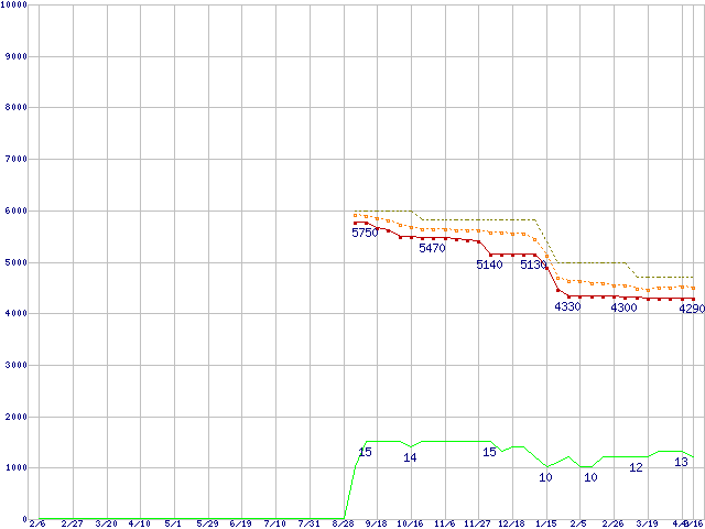 Celeron E3300 (2.5GHz)の価格推移↑前グラフ↓次グラフ(2009年2月6日〜2010年4月16日)※このグラフは過去のデータも税率5%相当に調整した税込み相当額のグラフです。●関連グラフCPU主要製品の最安値推移CPU主要製品(最安値1万円未満)の最安値推移Intel系CPUの最安値推移LGA775 (FSB 800MHz,L2 1MB,Dual Core,TDP 65W)の最安値推移●凡例最安値(点線部は販売店未確認または未調査)平均値最高値ショップ数