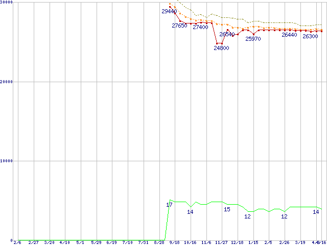 Core i7-860 (2.80GHz)の価格推移↑前グラフ↓次グラフ(2009年2月6日〜2010年4月16日)※このグラフは過去のデータも税率5%相当に調整した税込み相当額のグラフです。●関連グラフCPU主要製品の最安値推移CPU主要製品(最安値2万円〜3万円未満)の最安値推移Intel系CPUの最安値推移LGA1156 (L3キャッシュ8MB,Quad Core,Hyper-Threading,TDP 82〜95W)の最安値推移●凡例最安値(点線部は販売店未確認または未調査)平均値最高値ショップ数