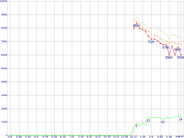 WD10EARS (1TB,64MB)の価格推移↑前グラフ↓次グラフ(2009年2月5日〜2010年4月15日)※このグラフは過去のデータも税率5%相当に調整した税込み相当額のグラフです。 税率変更や、総額表示方式導入(2004年4月)の影響は除いています。●関連グラフHDD/SSD主要製品の最安値推移HDD/SSD主要製品(最安値1万円未満)の最安値推移HDD 1TB〜1.5TB未満の最安値推移WD Caviar Green (3Gb/s)の最安値推移●凡例最安値(点線部は販売店未確認または未調査)平均値最高値ショップ数