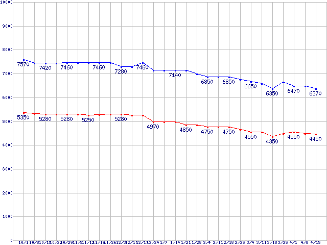 | Travelstar 5K500.B (5400rpm,3Gb/s,2.5インチ)の最安値推移 |