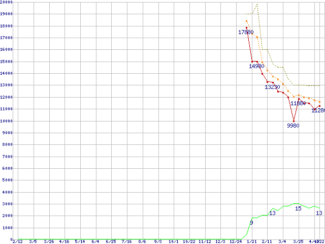 WD20EARS (2TB,64MB)の価格推移↑前グラフ↓次グラフ(2009年2月12日〜2010年4月22日)※このグラフは過去のデータも税率5%相当に調整した税込み相当額のグラフです。 税率変更や、総額表示方式導入(2004年4月)の影響は除いています。●関連グラフHDD/SSD主要製品の最安値推移HDD/SSD主要製品(最安値1万円〜1万5千円未満)の最安値推移HDD 2TB以上の最安値推移WD Caviar Green (3Gb/s)の最安値推移●凡例最安値(点線部は販売店未確認または未調査)平均値最高値ショップ数