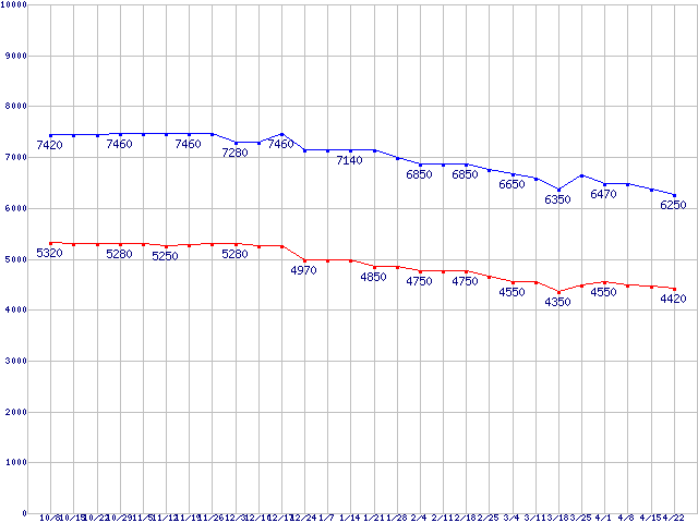 | Travelstar 5K500.B (5400rpm,3Gb/s,2.5インチ)の最安値推移 |