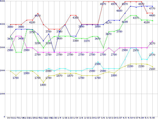 | メモリ主要製品(最安値5千円未満)の最安値推移 |