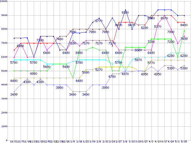 | メモリ主要製品(最安値5千円〜1万円未満)の最安値推移 |