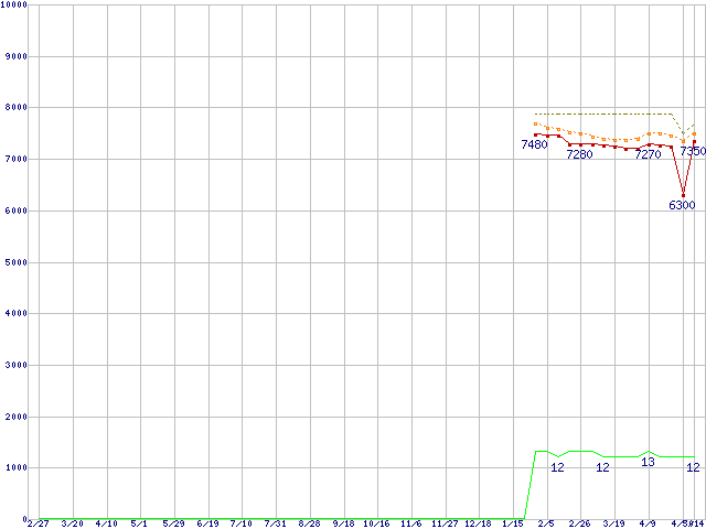 Athlon II X2 255 (3.1GHz,L2 1MB×2,TDP 65W)の価格推移↑前グラフ↓次グラフ(2009年2月27日〜2010年5月14日)※このグラフは過去のデータも税率5%相当に調整した税込み相当額のグラフです。●関連グラフCPU主要製品の最安値推移CPU主要製品(最安値1万円未満)の最安値推移AMD系CPUの最安値推移Socket AM3 (Dual Core)の最安値推移●凡例最安値(点線部は販売店未確認または未調査)平均値最高値ショップ数