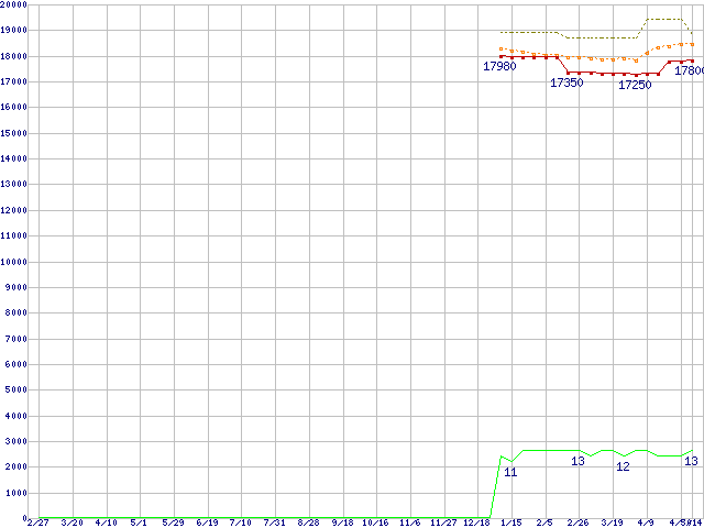 Core i5-650 (3.2GHz)の価格推移↑前グラフ↓次グラフ(2009年2月27日〜2010年5月14日)※このグラフは過去のデータも税率5%相当に調整した税込み相当額のグラフです。●関連グラフCPU主要製品の最安値推移CPU主要製品(最安値1万円〜2万円未満)の最安値推移Intel系CPUの最安値推移LGA1156 (L3キャッシュ4MB,Dual Core,GPU内蔵,Hyper-Threading,TDP 73〜87W)の最安値推移●凡例最安値(点線部は販売店未確認または未調査)平均値最高値ショップ数