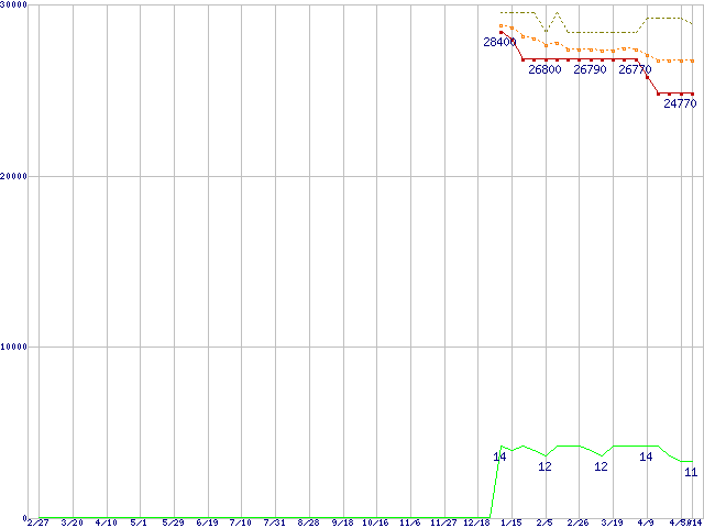 Core i5-670 (3.46GHz)の価格推移↑前グラフ↓次グラフ(2009年2月27日〜2010年5月14日)※このグラフは過去のデータも税率5%相当に調整した税込み相当額のグラフです。●関連グラフCPU主要製品の最安値推移CPU主要製品(最安値2万円〜3万円未満)の最安値推移Intel系CPUの最安値推移LGA1156 (L3キャッシュ4MB,Dual Core,GPU内蔵,Hyper-Threading,TDP 73〜87W)の最安値推移●凡例最安値(点線部は販売店未確認または未調査)平均値最高値ショップ数