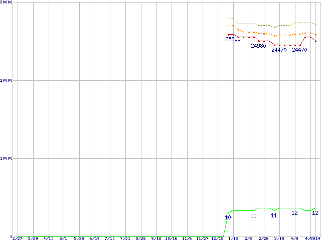 Core i5-750S (2.4GHz)の価格推移↑前グラフ(2009年2月27日〜2010年5月14日)※このグラフは過去のデータも税率5%相当に調整した税込み相当額のグラフです。●関連グラフCPU主要製品の最安値推移CPU主要製品(最安値2万円〜3万円未満)の最安値推移Intel系CPUの最安値推移LGA1156 (L3キャッシュ8MB,Quad Core,TDP 82〜95W)の最安値推移●凡例最安値(点線部は販売店未確認または未調査)平均値最高値ショップ数