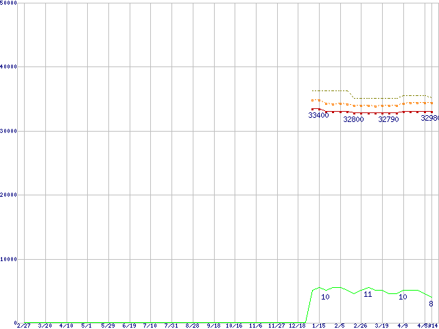 Core i7-860S (2.53GHz)の価格推移↑前グラフ↓次グラフ(2009年2月27日〜2010年5月14日)※このグラフは過去のデータも税率5%相当に調整した税込み相当額のグラフです。●関連グラフCPU主要製品の最安値推移CPU主要製品(最安値3万円〜6万円未満)の最安値推移Intel系CPUの最安値推移LGA1156 (L3キャッシュ8MB,Quad Core,Hyper-Threading,TDP 82〜95W)の最安値推移●凡例最安値(点線部は販売店未確認または未調査)平均値最高値ショップ数