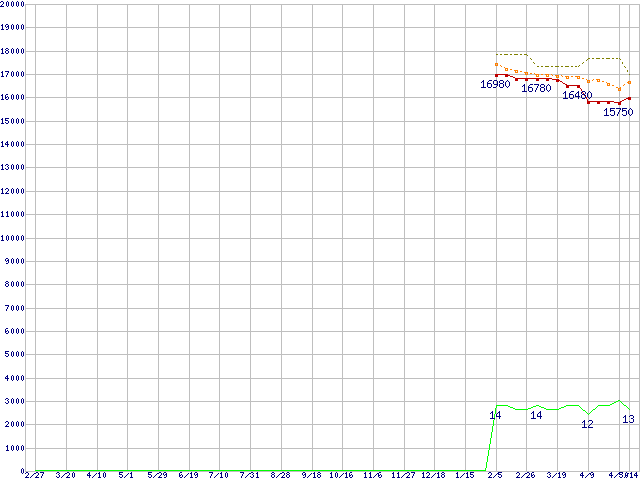 Phenom II X4 910e (2.6GHz,L2 512KB×4,L3 6MB,TDP 65W)の価格推移↑前グラフ↓次グラフ(2009年2月27日〜2010年5月14日)※このグラフは過去のデータも税率5%相当に調整した税込み相当額のグラフです。●関連グラフCPU主要製品の最安値推移CPU主要製品(最安値1万円〜2万円未満)の最安値推移AMD系CPUの最安値推移Socket AM3 (HyperTransport 3.0,Quad Core)の最安値推移●凡例最安値(点線部は販売店未確認または未調査)平均値最高値ショップ数