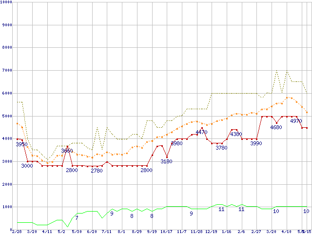 PC3-10600 2GBの価格推移↑前グラフ↓次グラフ(2009年2月28日〜2010年5月15日)※このグラフは過去のデータも税率5%相当に調整した税込み相当額のグラフです。 税率変更や、総額表示方式導入(2004年4月)の影響は除いています。●関連グラフメモリ主要製品の最安値推移2GBモジュール/1GBモジュール×2枚の最安値推移メモリ主要製品(最安値5千円未満)の最安値推移PC3-10600(DDR3-1333) DDR3 SDRAM DIMMの最安値推移●凡例最安値(点線部は販売店未確認または未調査)平均値最高値ショップ数
