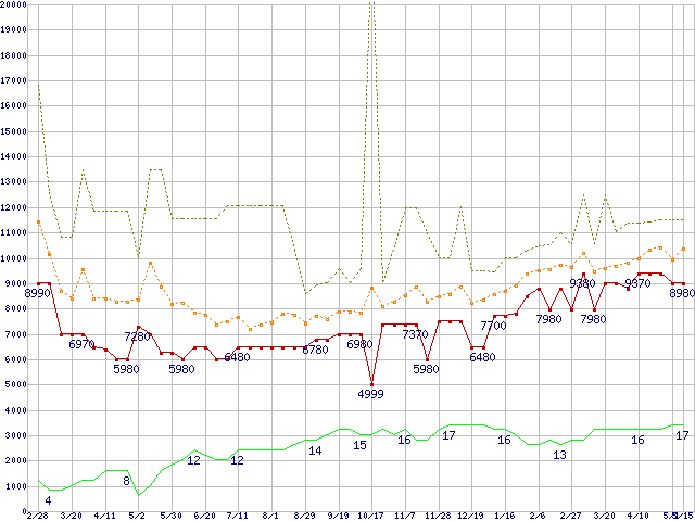 PC3-10600 2GB×2枚組みセットの価格推移↑前グラフ↓次グラフ(2009年2月28日〜2010年5月15日)※このグラフは過去のデータも税率5%相当に調整した税込み相当額のグラフです。 税率変更や、総額表示方式導入(2004年4月)の影響は除いています。●関連グラフメモリ主要製品の最安値推移4GBモジュール/2GBモジュール×2枚の最安値推移メモリ主要製品(最安値5千円〜1万円未満)の最安値推移PC3-10600(DDR3-1333) DDR3 SDRAM DIMMの最安値推移●凡例最安値(点線部は販売店未確認または未調査)平均値最高値ショップ数