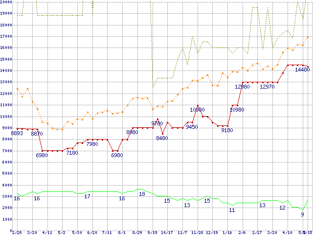 PC3-10600 2GB×3枚組みセットの価格推移↑前グラフ↓次グラフ(2009年2月28日〜2010年5月15日)※このグラフは過去のデータも税率5%相当に調整した税込み相当額のグラフです。 税率変更や、総額表示方式導入(2004年4月)の影響は除いています。●関連グラフメモリ主要製品の最安値推移メモリ主要製品(最安値1万円以上)の最安値推移PC3-10600(DDR3-1333) DDR3 SDRAM DIMMの最安値推移●凡例最安値(点線部は販売店未確認または未調査)平均値最高値ショップ数