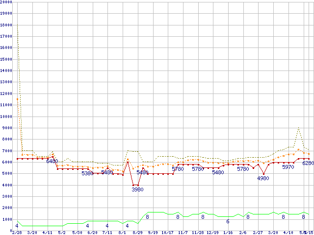 PC3-12800 1GB×2枚組みセットの価格推移↑前グラフ↓次グラフ(2009年2月28日〜2010年5月15日)※このグラフは過去のデータも税率5%相当に調整した税込み相当額のグラフです。 税率変更や、総額表示方式導入(2004年4月)の影響は除いています。●関連グラフメモリ主要製品の最安値推移2GBモジュール/1GBモジュール×2枚の最安値推移メモリ主要製品(最安値5千円〜1万円未満)の最安値推移PC3-12800(DDR3-1600) DDR3 SDRAM DIMMの最安値推移●凡例最安値(点線部は販売店未確認または未調査)平均値最高値ショップ数