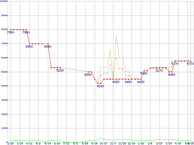 PC3-12800 2GBの価格推移↑前グラフ↓次グラフ(2009年2月28日〜2010年5月15日)※このグラフは過去のデータも税率5%相当に調整した税込み相当額のグラフです。 税率変更や、総額表示方式導入(2004年4月)の影響は除いています。●関連グラフメモリ主要製品の最安値推移2GBモジュール/1GBモジュール×2枚の最安値推移メモリ主要製品(最安値5千円〜1万円未満)の最安値推移PC3-12800(DDR3-1600) DDR3 SDRAM DIMMの最安値推移●凡例最安値(点線部は販売店未確認または未調査)平均値最高値ショップ数