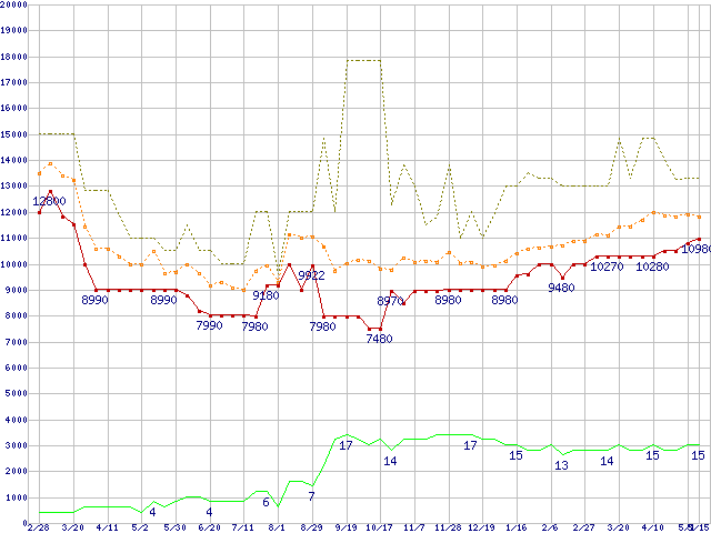 PC3-12800 2GB×2枚組みセットの価格推移↑前グラフ↓次グラフ(2009年2月28日〜2010年5月15日)※このグラフは過去のデータも税率5%相当に調整した税込み相当額のグラフです。 税率変更や、総額表示方式導入(2004年4月)の影響は除いています。●関連グラフメモリ主要製品の最安値推移4GBモジュール/2GBモジュール×2枚の最安値推移メモリ主要製品(最安値1万円以上)の最安値推移PC3-12800(DDR3-1600) DDR3 SDRAM DIMMの最安値推移●凡例最安値(点線部は販売店未確認または未調査)平均値最高値ショップ数