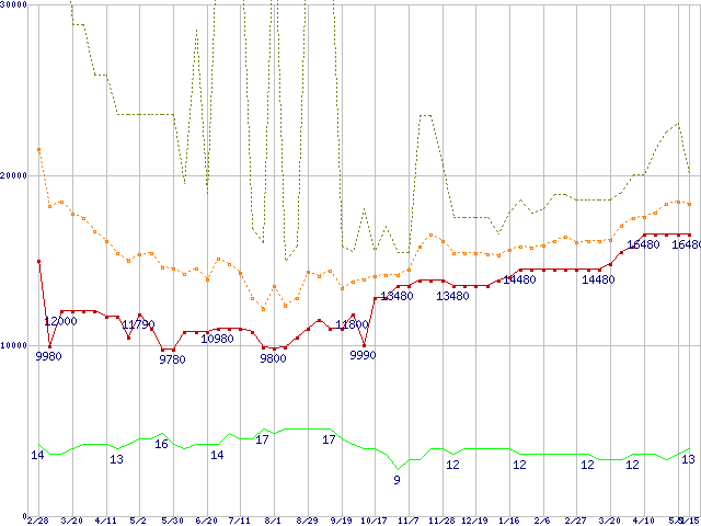 PC3-12800 2GB×3枚組みセットの価格推移↑前グラフ↓次グラフ(2009年2月28日〜2010年5月15日)※このグラフは過去のデータも税率5%相当に調整した税込み相当額のグラフです。 税率変更や、総額表示方式導入(2004年4月)の影響は除いています。●関連グラフメモリ主要製品の最安値推移メモリ主要製品(最安値1万円以上)の最安値推移PC3-12800(DDR3-1600) DDR3 SDRAM DIMMの最安値推移●凡例最安値(点線部は販売店未確認または未調査)平均値最高値ショップ数