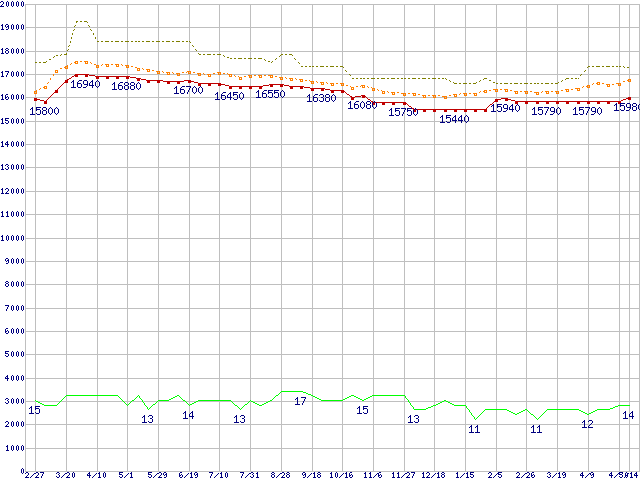 Core 2 Duo E8400 (3GHz,L2 6MB)の価格推移↑前グラフ↓次グラフ(2009年2月27日〜2010年5月14日)※このグラフは過去のデータも税率5%相当に調整した税込み相当額のグラフです。●関連グラフCPU主要製品の最安値推移CPU主要製品(最安値1万円〜2万円未満)の最安値推移Intel系CPUの最安値推移LGA775 (FSB 1333MHz,Dual Core,TDP 65W)の最安値推移●凡例最安値(点線部は販売店未確認または未調査)平均値最高値ショップ数