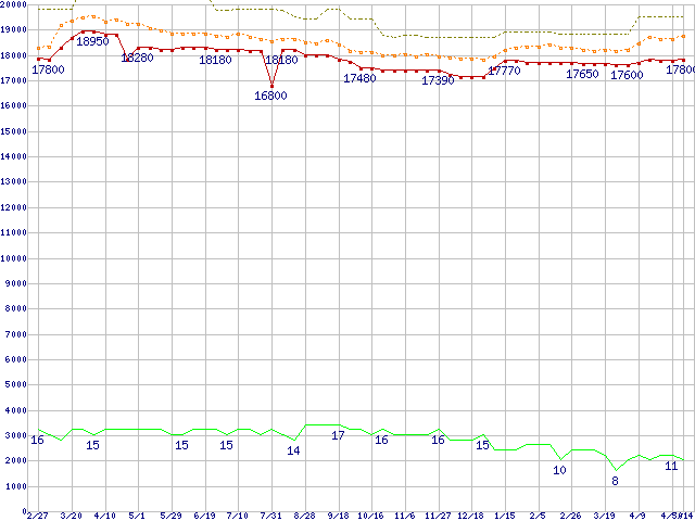 Core 2 Duo E8500 (3.16GHz,L2 6MB)の価格推移↑前グラフ↓次グラフ(2009年2月27日〜2010年5月14日)※このグラフは過去のデータも税率5%相当に調整した税込み相当額のグラフです。●関連グラフCPU主要製品の最安値推移CPU主要製品(最安値1万円〜2万円未満)の最安値推移Intel系CPUの最安値推移LGA775 (FSB 1333MHz,Dual Core,TDP 65W)の最安値推移●凡例最安値(点線部は販売店未確認または未調査)平均値最高値ショップ数