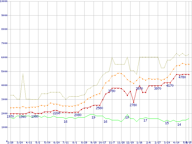 PC2-6400 1GB×2枚組みセットの価格推移↑前グラフ↓次グラフ(2009年2月28日〜2010年5月15日)※このグラフは過去のデータも税率5%相当に調整した税込み相当額のグラフです。 税率変更や、総額表示方式導入(2004年4月)の影響は除いています。●関連グラフメモリ主要製品の最安値推移2GBモジュール/1GBモジュール×2枚の最安値推移メモリ主要製品(最安値5千円未満)の最安値推移PC2-6400(DDR2-800) DDR2 SDRAM DIMMの最安値推移●凡例最安値(点線部は販売店未確認または未調査)平均値最高値ショップ数