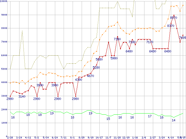 PC2-6400 2GB×2枚組みセットの価格推移↑前グラフ↓次グラフ(2009年2月28日〜2010年5月15日)※このグラフは過去のデータも税率5%相当に調整した税込み相当額のグラフです。 税率変更や、総額表示方式導入(2004年4月)の影響は除いています。●関連グラフメモリ主要製品の最安値推移4GBモジュール/2GBモジュール×2枚の最安値推移メモリ主要製品(最安値5千円〜1万円未満)の最安値推移PC2-6400(DDR2-800) DDR2 SDRAM DIMMの最安値推移●凡例最安値(点線部は販売店未確認または未調査)平均値最高値ショップ数