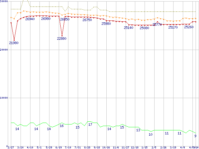 Core 2 Duo E8600 (3.33GHz,L2 6MB)の価格推移↓次グラフ(2009年2月27日〜2010年5月14日)※このグラフは過去のデータも税率5%相当に調整した税込み相当額のグラフです。●関連グラフCPU主要製品の最安値推移CPU主要製品(最安値2万円〜3万円未満)の最安値推移Intel系CPUの最安値推移LGA775 (FSB 1333MHz,Dual Core,TDP 65W)の最安値推移●凡例最安値(点線部は販売店未確認または未調査)平均値最高値ショップ数