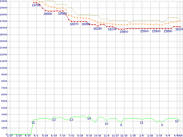 Core 2 Quad Q8400 (2.66GHz,L2 2MB×2)の価格推移↑前グラフ↓次グラフ(2009年2月27日〜2010年5月14日)※このグラフは過去のデータも税率5%相当に調整した税込み相当額のグラフです。●関連グラフCPU主要製品の最安値推移CPU主要製品(最安値1万円〜2万円未満)の最安値推移Intel系CPUの最安値推移LGA775 (FSB 1333MHz,Quad Core,TDP 95W)の最安値推移●凡例最安値(点線部は販売店未確認または未調査)平均値最高値ショップ数