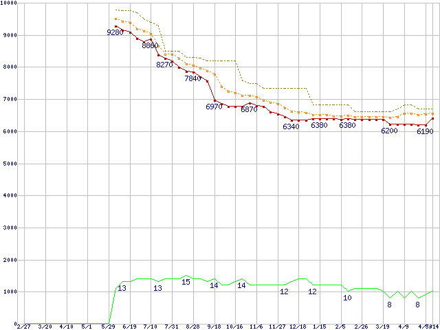 Athlon II X2 250 (3.0GHz,L2 1MB×2,TDP 65W)の価格推移↑前グラフ↓次グラフ(2009年2月27日〜2010年5月14日)※このグラフは過去のデータも税率5%相当に調整した税込み相当額のグラフです。●関連グラフCPU主要製品の最安値推移CPU主要製品(最安値1万円未満)の最安値推移AMD系CPUの最安値推移Socket AM3 (Dual Core)の最安値推移●凡例最安値(点線部は販売店未確認または未調査)平均値最高値ショップ数