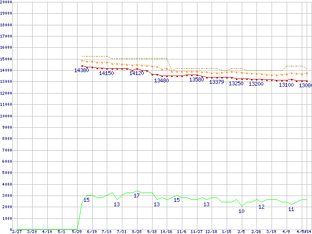 Core 2 Duo E7600 (3.06GHz,L2 3MB)の価格推移↑前グラフ↓次グラフ(2009年2月27日〜2010年5月14日)※このグラフは過去のデータも税率5%相当に調整した税込み相当額のグラフです。●関連グラフCPU主要製品の最安値推移CPU主要製品(最安値1万円〜2万円未満)の最安値推移Intel系CPUの最安値推移LGA775 (FSB 1066MHz,Dual Core,TDP 65W)の最安値推移●凡例最安値(点線部は販売店未確認または未調査)平均値最高値ショップ数